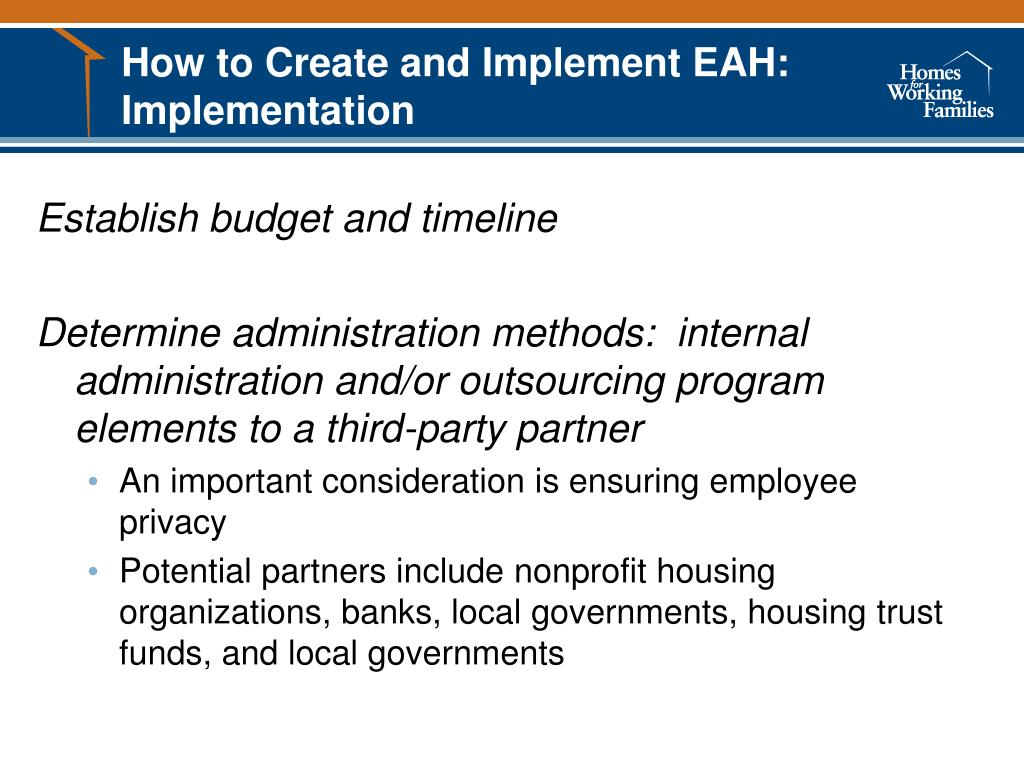 How to Create and Implement EAH: Implementation Establish budget and timeline Determine administration methods: internal administration and/or outsourcing program elements to a third-party partner • An important consideration is ensuring employee privacy • Potential partners include nonprofit housing organizations, banks, local governments, housing trust funds, and local governments