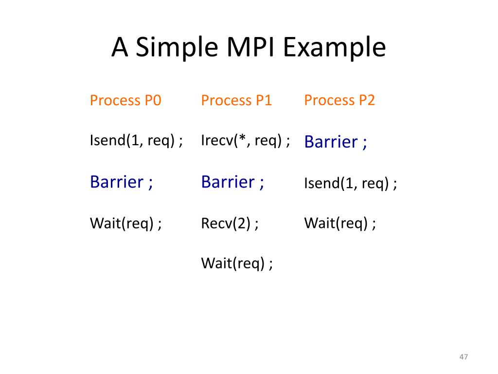 A Simple MPI Example Process P2 Barrier ; Isend(1, req) ; Wait(req) ; Process P0 Isend(1, req) ; Barrier ; Wait(req) ; Process P1 Irecv(*, req) ; Barrier ; Recv(2) ; Wait(req) ;