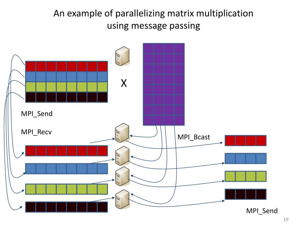 An example of parallelizing matrix multiplication using message passing MPI_Recv X = MPI_Send MPI_Recv MPI_Bcast MPI_Send