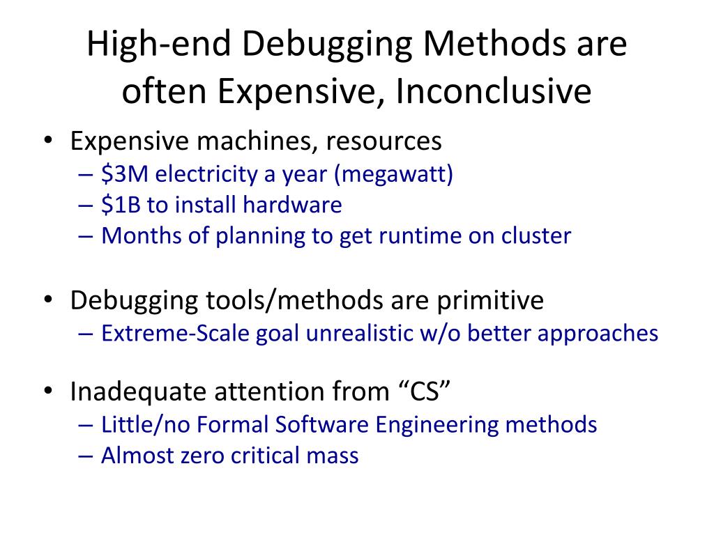 High-end Debugging Methods areoften Expensive, Inconclusive • Expensive machines, resources • $3M electricity a year (megawatt) • $1B to install hardware • Months of planning to get runtime on cluster • Debugging tools/methods are primitive • Extreme-Scale goal unrealistic w/o better approaches • Inadequate attention from “CS” • Little/no Formal Software Engineering methods • Almost zero critical mass
