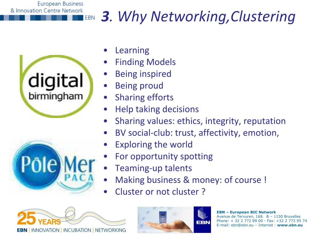 3. WhyNetworking,Clustering • Learning • FindingModels • Beinginspired • Beingproud • Sharing efforts • Help takingdecisions • Sharing values: ethics, integrity, reputation • BV social-club: trust, affectivity, emotion, • Exploring the world • For opportunityspotting • Teaming-up talents • Making business & money: of course ! • Cluster or not cluster ?