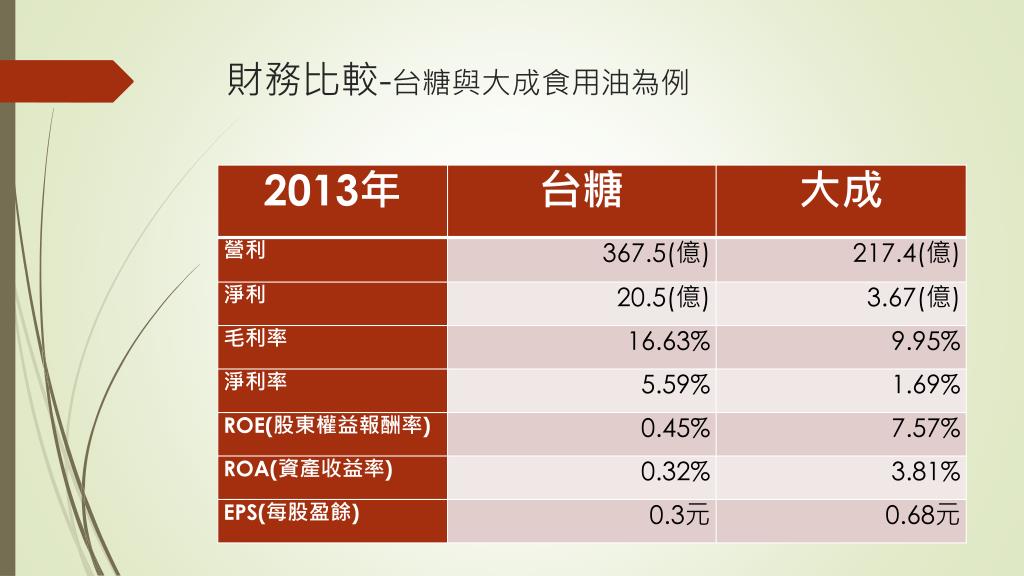 財務現況分析 • 2013年本期淨利約為新台幣49億元,合併綜合損益約為新台幣57億元,每股盈餘為0.64元。 • 2014年本期淨利約為新台幣20億元,合併綜合損益約為新台幣72億元,每股盈餘為0.3元。 • 在2013年備供出售金融資產未實現評價損益約為8億元,在2014年備供出售金融資產未實現評價損益約為51億元。 • 近期台糖似乎因負債而出售土地,因台糖的地在早期都是經過挑選的良地,破壞該地原本的面貌,違反了當初的只租不賣。