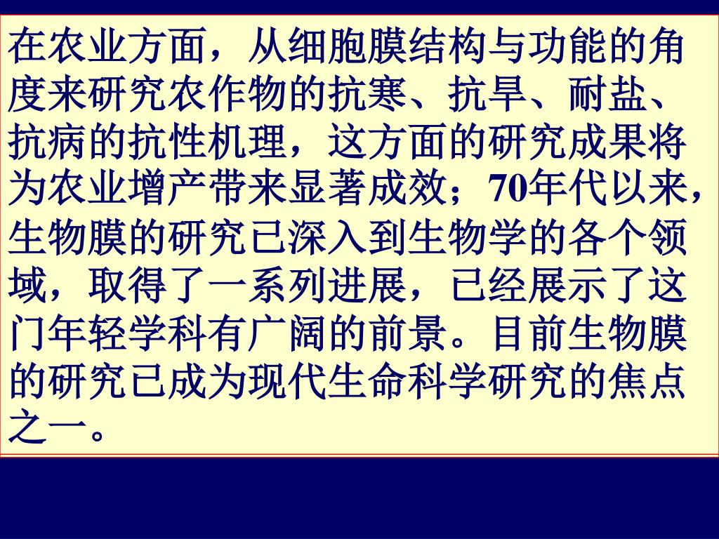 在农业方面,从细胞膜结构与功能的角度来研究农作物的抗寒、抗旱、耐盐、抗病的抗性机理,这方面的研究成果将为农业增产带来显著成效;70年代以来,生物膜的研究已深入到生物学的各个领域,取得了一系列进展,已经展示了这门年轻学科有广阔的前景。目前生物膜的研究已成为现代生命科学研究的焦点之一。在农业方面,从细胞膜结构与功能的角度来研究农作物的抗寒、抗旱、耐盐、抗病的抗性机理,这方面的研究成果将为农业增产带来显著成效;70年代以来,生物膜的研究已深入到生物学的各个领域,取得了一系列进展,已经展示了这门年轻学科有广阔的前景。目前生物膜的研究已成为现代生命科学研究的焦点之一。 研究生物膜的重要意义生:物膜的研究不仅只有重要的理论意义,而且在工、农、医实践方面也有很广阔的应用前景。例如,在医药方面,用磷脂和能识别癌细胞表面抗原的抗体制成内含抗癌药物的微囊,能定向地杀死癌细胞。在工业方面,正在模拟生物膜选择透性的功能,一旦成功将大大提高污水处理、海水淡化以及工业副产品回收的效率。 生物膜的重要性:生物膜结构是细胞结构的重要组成部分。在真核细胞中,膜结构约占整个细胞干重的70%~80%。这些膜结构不仅与细胞骨架一起提供了细胞赖以生存的空间,即构成了维持细胞内环境相对稳定的有高度选择性的半透性,是生命活动的主要结构基础。 它们直接参与物质转运、能量转换、信息传递、细胞识别等重要的生命活动。细胞的形态发生、分化、生长、分裂以及细胞免疫、代谢调控、神经传导、肿瘤发生、吞饮与分泌作用、药物和毒物的作用、生物体对环境的反应等等,都与生物膜有密切的联系。