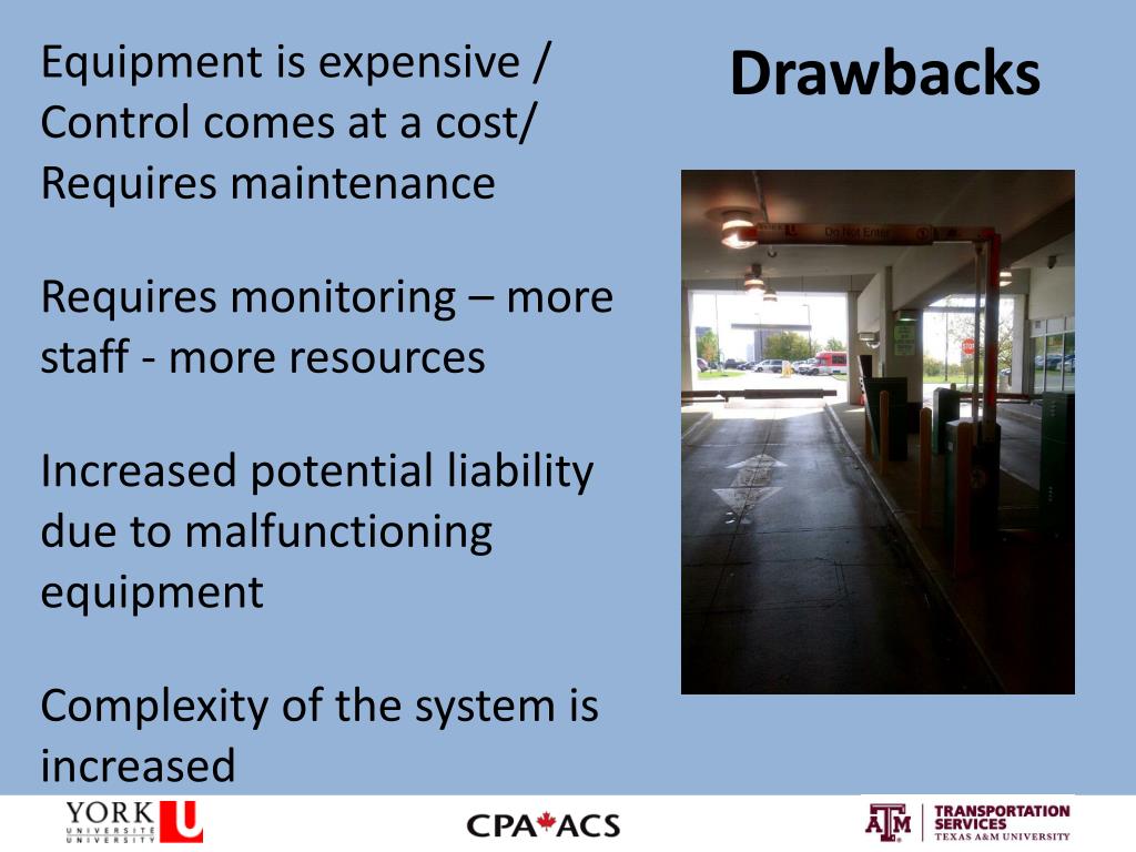 Drawbacks • Equipment is expensive / Control comes at a cost/ • Requires maintenance • Requires monitoring – more staff - more resources • Increased potential liability due to malfunctioning equipment • Complexity of the system is increased
