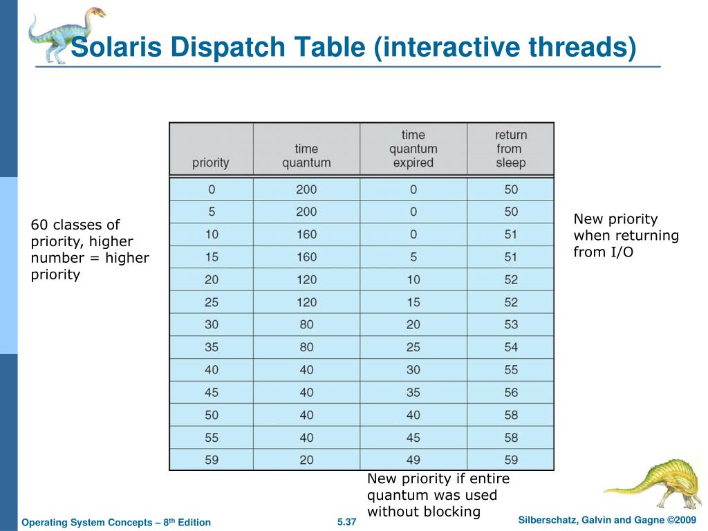 Solaris Dispatch Table (interactive threads) New priority when returning from I/O 60 classes of priority, higher number = higher priority New priority if entire quantum was used without blocking