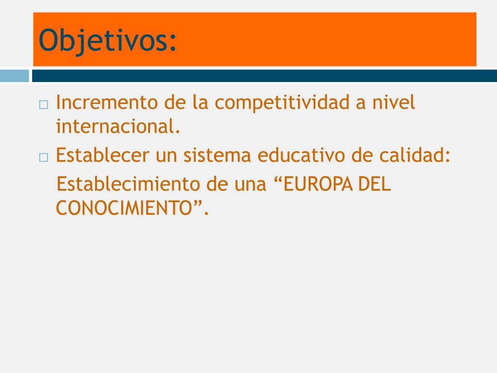 Objetivos: • Incremento de la competitividad a nivel internacional. • Establecer un sistema educativo de calidad: Establecimiento de una “EUROPA DEL CONOCIMIENTO”.