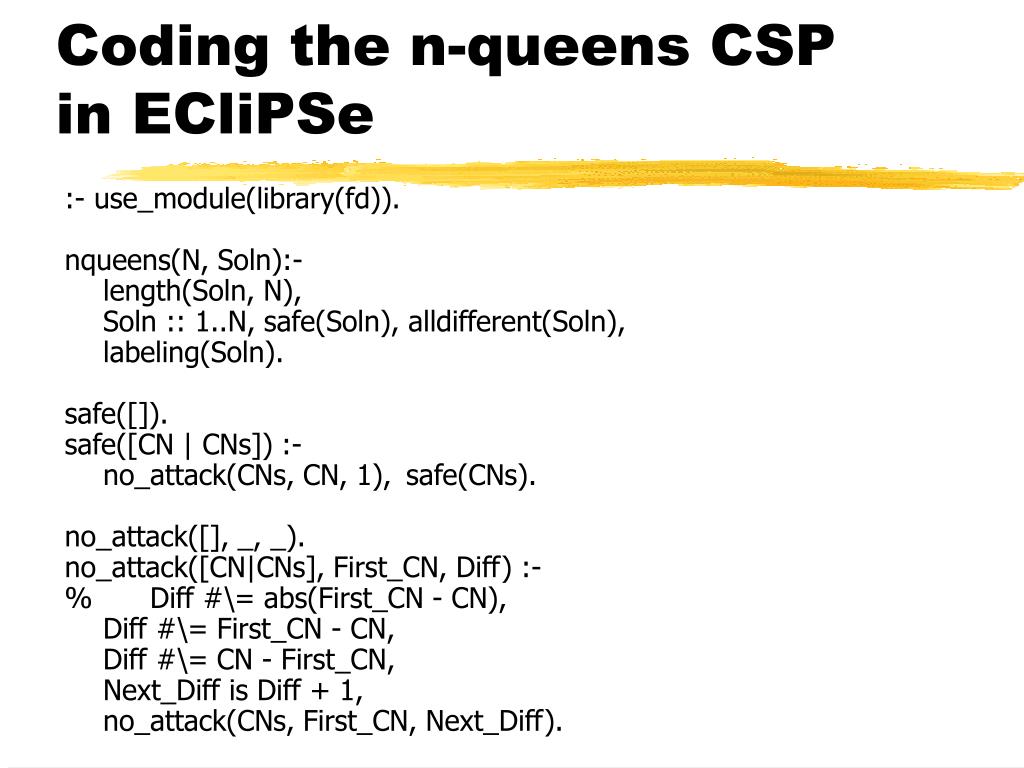 Coding the n-queens CSP in ECliPSe :- use_module(library(fd)). nqueens(N, Soln):- length(Soln, N), Soln :: 1..N, safe(Soln), alldifferent(Soln), labeling(Soln). safe([]). safe([CN | CNs]) :- no_attack(CNs, CN, 1), safe(CNs). no_attack([], _, _). no_attack([CN|CNs], First_CN, Diff) :- % Diff #\= abs(First_CN - CN), Diff #\= First_CN - CN, Diff #\= CN - First_CN, Next_Diff is Diff + 1, no_attack(CNs, First_CN, Next_Diff).