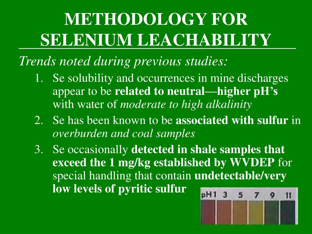 METHODOLOGY FOR SELENIUM LEACHABILITY ________________________________________ Trends noted during previous studies: • Se solubility and occurrences in mine discharges appear to be related to neutral—higher pH’s with water of moderate to high alkalinity • Se has been known to be associated with sulfur in overburden and coal samples • Se occasionally detected in shale samplesthat exceed the 1 mg/kg established by WVDEP for special handling that contain undetectable/very low levels of pyritic sulfur