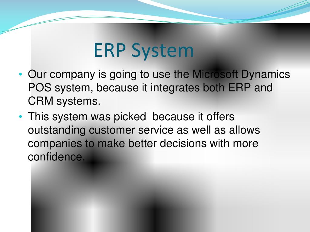 ERP System • Our company is going to use the Microsoft Dynamics POS system, because it integrates both ERP and CRM systems. • This system was picked because it offers outstanding customer service as well as allows companies to make better decisions with more confidence.