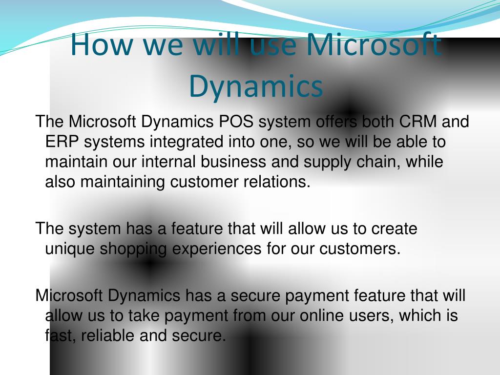 How we will use Microsoft Dynamics The Microsoft Dynamics POS system offers both CRM and ERP systems integrated into one, so we will be able to maintain our internal business and supply chain, while also maintaining customer relations. The system has a feature that will allow us to create unique shopping experiences for our customers. Microsoft Dynamics has a secure payment feature that will allow us to take payment from our online users, which is fast, reliable and secure.