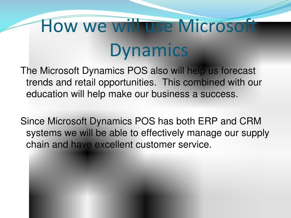 How we will use Microsoft Dynamics The Microsoft Dynamics POS also will help us forecast trends and retail opportunities. This combined with our education will help make our business a success. Since Microsoft Dynamics POS has both ERP and CRM systems we will be able to effectively manage our supply chain and have excellent customer service.