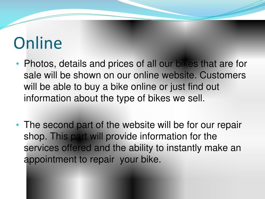 Online • Photos, details and prices of all our bikes that are for sale will be shown on our online website. Customers will be able to buy a bike online or just find out information about the type of bikes we sell. • The second part of the website will be for our repair shop. This part will provide information for the services offered and the ability to instantly make an appointment to repair your bike.