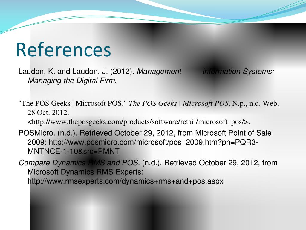 References Laudon, K. and Laudon, J. (2012). Management Information Systems: Managing the Digital Firm. "The POS Geeks | Microsoft POS." The POS Geeks | Microsoft POS. N.p., n.d. Web. 28 Oct. 2012. <http://www.theposgeeks.com/products/software/retail/microsoft_pos/>. POSMicro. (n.d.). Retrieved October 29, 2012, from Microsoft Point of Sale 2009: http://www.posmicro.com/microsoft/pos_2009.htm?pn=PQR3-MNTNCE-1-10&src=PMNT Compare Dynamics RMS and POS. (n.d.). Retrieved October 29, 2012, from Microsoft Dynamics RMS Experts: http://www.rmsexperts.com/dynamics+rms+and+pos.aspx