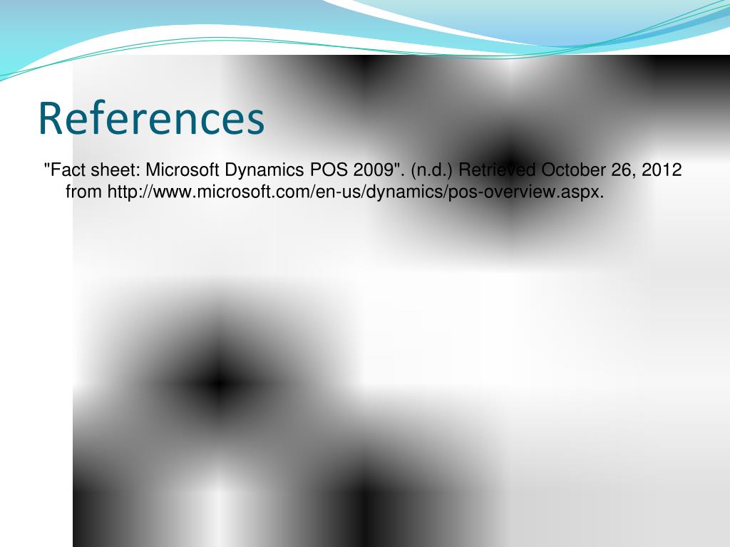 References "Fact sheet: Microsoft Dynamics POS 2009". (n.d.) Retrieved October 26, 2012 from http://www.microsoft.com/en-us/dynamics/pos-overview.aspx.