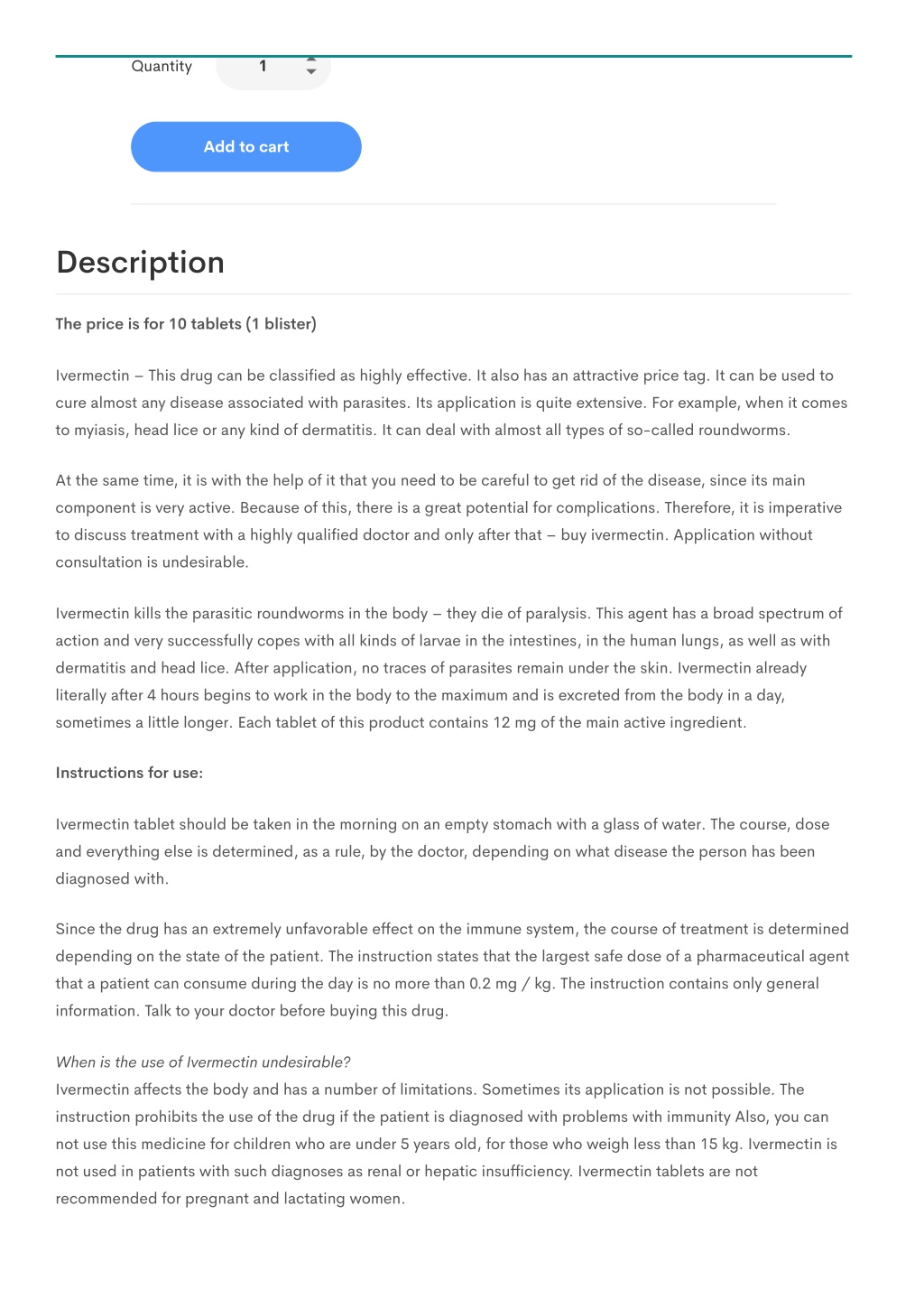Quantity 1 Add to cart Description The price is for 10 tablets (1 blister) Ivermectin – This drug can be classified as highly e?ective. It also has an attractive price tag. It can be used to cure almost any disease associated with parasites. Its application is quite extensive. For example, when it comes to myiasis, head lice or any kind of dermatitis. It can deal with almost all types of so-called roundworms. At the same time, it is with the help of it that you need to be careful to get rid of the disease, since its main component is very active. Because of this, there is a great potential for complications. Therefore, it is imperative to discuss treatment with a highly qualified doctor and only after that – buy ivermectin. Application without consultation is undesirable. Ivermectin kills the parasitic roundworms in the body – they die of paralysis. This agent has a broad spectrum of action and very successfully copes with all kinds of larvae in the intestines, in the human lungs, as well as with dermatitis and head lice. After application, no traces of parasites remain under the skin. Ivermectin already literally after 4 hours begins to work in the body to the maximum and is excreted from the body in a day, sometimes a little longer. Each tablet of this product contains 12 mg of the main active ingredient. Instructions for use: Ivermectin tablet should be taken in the morning on an empty stomach with a glass of water. The course, dose and everything else is determined, as a rule, by the doctor, depending on what disease the person has been diagnosed with. Since the drug has an extremely unfavorable e?ect on the immune system, the course of treatment is determined depending on the state of the patient. The instruction states that the largest safe dose of a pharmaceutical agent that a patient can consume during the day is no more than 0.2 mg / kg. The instruction contains only general information. Talk to your doctor before buying this drug. When is the use of Ivermectin undesirable? Ivermectin a?ects the body and has a number of limitations. Sometimes its application is not possible. The instruction prohibits the use of the drug if the patient is diagnosed with problems with immunity Also, you can not use this medicine for children who are under 5 years old, for those who weigh less than 15 kg. Ivermectin is not used in patients with such diagnoses as renal or hepatic insu?iciency. Ivermectin tablets are not recommended for pregnant and lactating women.