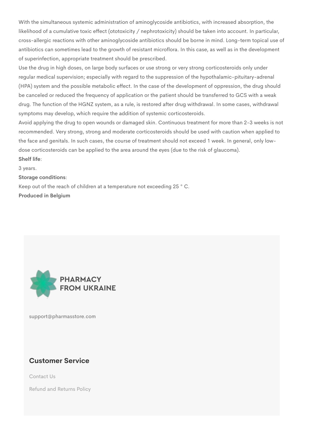 With the simultaneous systemic administration of aminoglycoside antibiotics, with increased absorption, the likelihood of a cumulative toxic e?ect (ototoxicity / nephrotoxicity) should be taken into account. In particular, cross-allergic reactions with other aminoglycoside antibiotics should be borne in mind. Long-term topical use of antibiotics can sometimes lead to the growth of resistant microflora. In this case, as well as in the development of superinfection, appropriate treatment should be prescribed. Use the drug in high doses, on large body surfaces or use strong or very strong corticosteroids only under regular medical supervision; especially with regard to the suppression of the hypothalamic-pituitary-adrenal (HPA) system and the possible metabolic e?ect. In the case of the development of oppression, the drug should be canceled or reduced the frequency of application or the patient should be transferred to GCS with a weak drug. The function of the HGNZ system, as a rule, is restored after drug withdrawal. In some cases, withdrawal symptoms may develop, which require the addition of systemic corticosteroids. Avoid applying the drug to open wounds or damaged skin. Continuous treatment for more than 2-3 weeks is not recommended. Very strong, strong and moderate corticosteroids should be used with caution when applied to the face and genitals. In such cases, the course of treatment should not exceed 1 week. In general, only low- dose corticosteroids can be applied to the area around the eyes (due to the risk of glaucoma). Shelf life: 3 years. Storage conditions: Keep out of the reach of children at a temperature not exceeding 25 ° C. Produced in Belgium support@pharmasstore.com Customer Service Contact Us Refund and Returns Policy