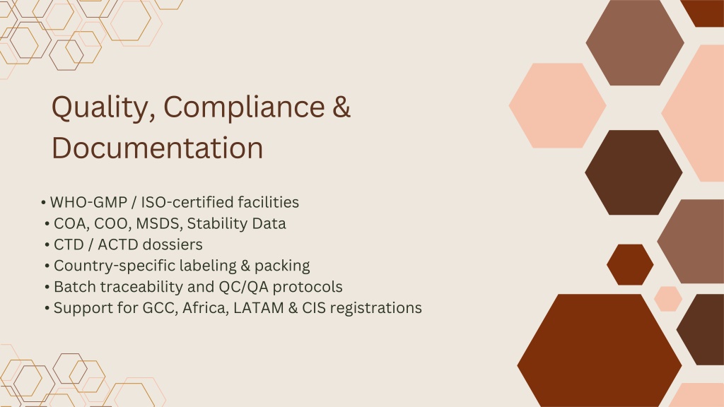 4. Quality, Compliance & Documentation • WHO-GMP / ISO-certified facilities • COA, COO, MSDS, Stability Data • CTD / ACTD dossiers • Country-specific labeling & packing • Batch traceability and QC/QA protocols • Support for GCC, Africa, LATAM & CIS registrations