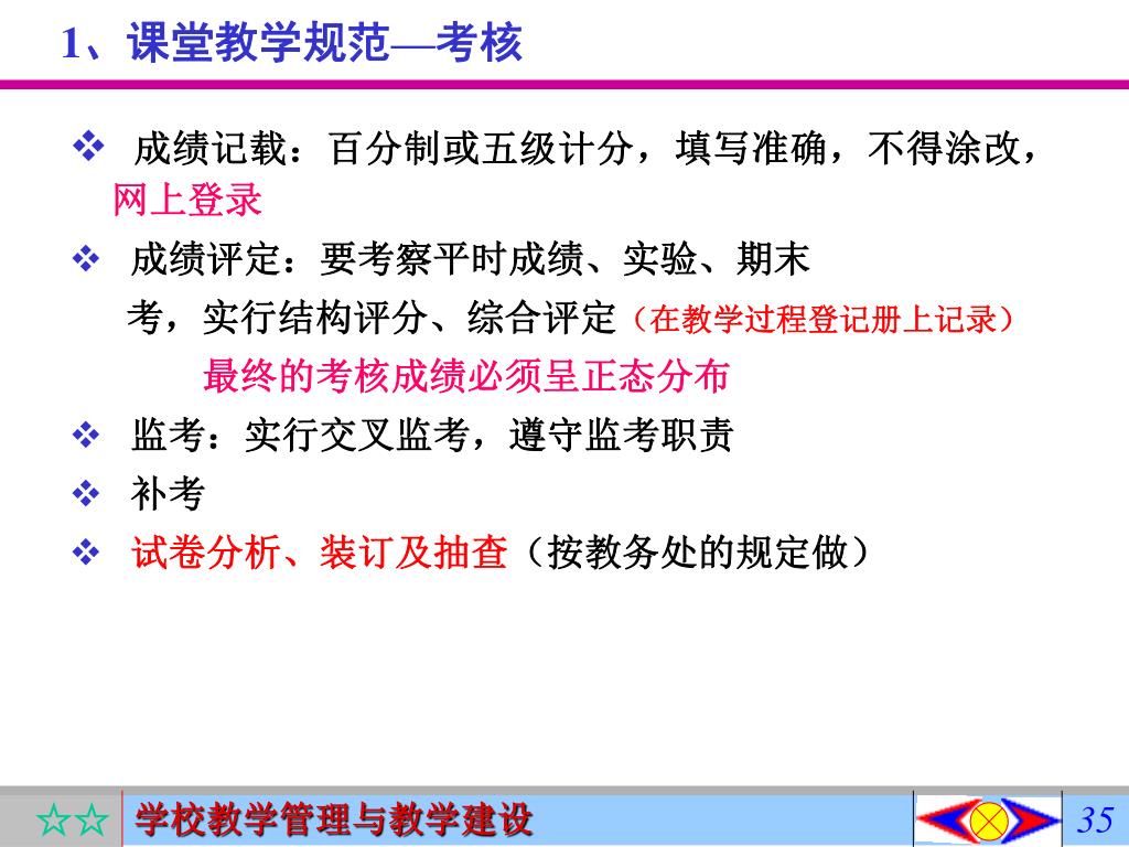 成绩记载:百分制或五级计分,填写准确,不得涂改,网上登录成绩记载:百分制或五级计分,填写准确,不得涂改,网上登录 成绩评定:要考察平时成绩、实验、期末 考,实行结构评分、综合评定(在教学过程登记册上记录) 最终的考核成绩必须呈正态分布 监考:实行交叉监考,遵守监考职责 补考 试卷分析、装订及抽查(按教务处的规定做) 1、课堂教学规范—考核