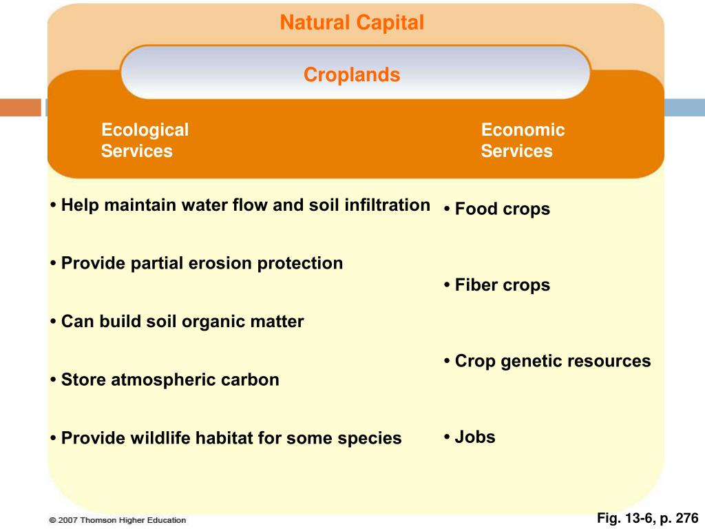 Natural Capital Croplands Ecological Services Economic Services • Help maintain water flow and soil infiltration • Food crops • Provide partial erosion protection • Fiber crops • Can build soil organic matter • Crop genetic resources • Store atmospheric carbon • Jobs • Provide wildlife habitat for some species Fig. 13-6, p. 276