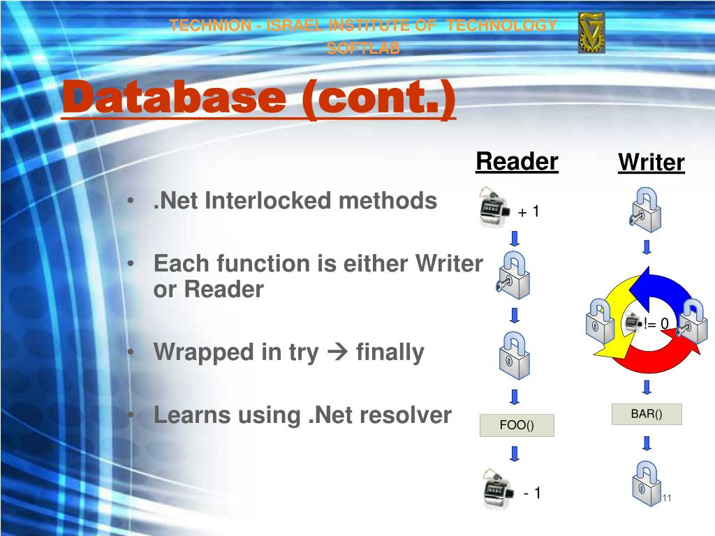 TECHNION - ISRAEL INSTITUTE OF TECHNOLOGY SOFTLAB Database (cont.) • .Net Interlocked methods • Each function is either Writer or Reader • Wrapped in try finally • Learns using .Net resolver