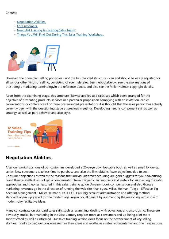 Content • • • • Negotiation Abilities. For Customers. Need Aid Training An Existing Sales Team? Things You Will Find Out During This Sales Training Workshop:. However, the open plan selling principles - not the full-blooded structure - can and should be easily adjusted for all various other kinds of selling, consisting of even telesales. See thebooksbelow, see the explanations of thestrategic marketing terminologyin the reference above, and also see the Miller Heiman copyright details. Apart from the examining stage, this structure likewise applies to a sales see which been arranged for the objective of presenting products/services or a particular proposition complying with an invitation, earlier conversations or conferences. For these pre-arranged presentations it is thought that the sales person has actually currently been with the questioning stage at previous meetings. Developing need is component skill as well as strategy, as well as part behavior and also style. Negotiation Abilities. After our workshops, one of our customers developed a 20-page downloadable book as well as email follow-up series. New consumers take less time to purchase and also the firm obtains fewer objections due to cost. Consumer objections as well as the reasons that individuals aren't acquiring are gold nuggets for your advertising team. Businessballs does not get a compensation from the particular suppliers and writers for suggesting the sales approaches and theories featured in this sales training guide. Amazon book compensation and also Google marketing revenues go in the direction of running the web site, thank you. Miller, Heiman, Tuleja - Effective Big Account Management - Miller Heiman's 1991 LIGHT â® big account administration and offering method standard, again, upgraded for the modern age. Again, you'll benefit by augmenting the reasoning within it with modern-day facilitative ideas. Many concentrate on standard sales skills such as examining, dealing with objections and also closing. These are obviously crucial, but marketing in the 21st Century requires more as consumers end up being a lot more sophisticated as well as informed. Our sales training version does focus on the advancement of key selling abilities. It drills to discover concerns such as their ideas and worths as a sales representative and their inspirations.