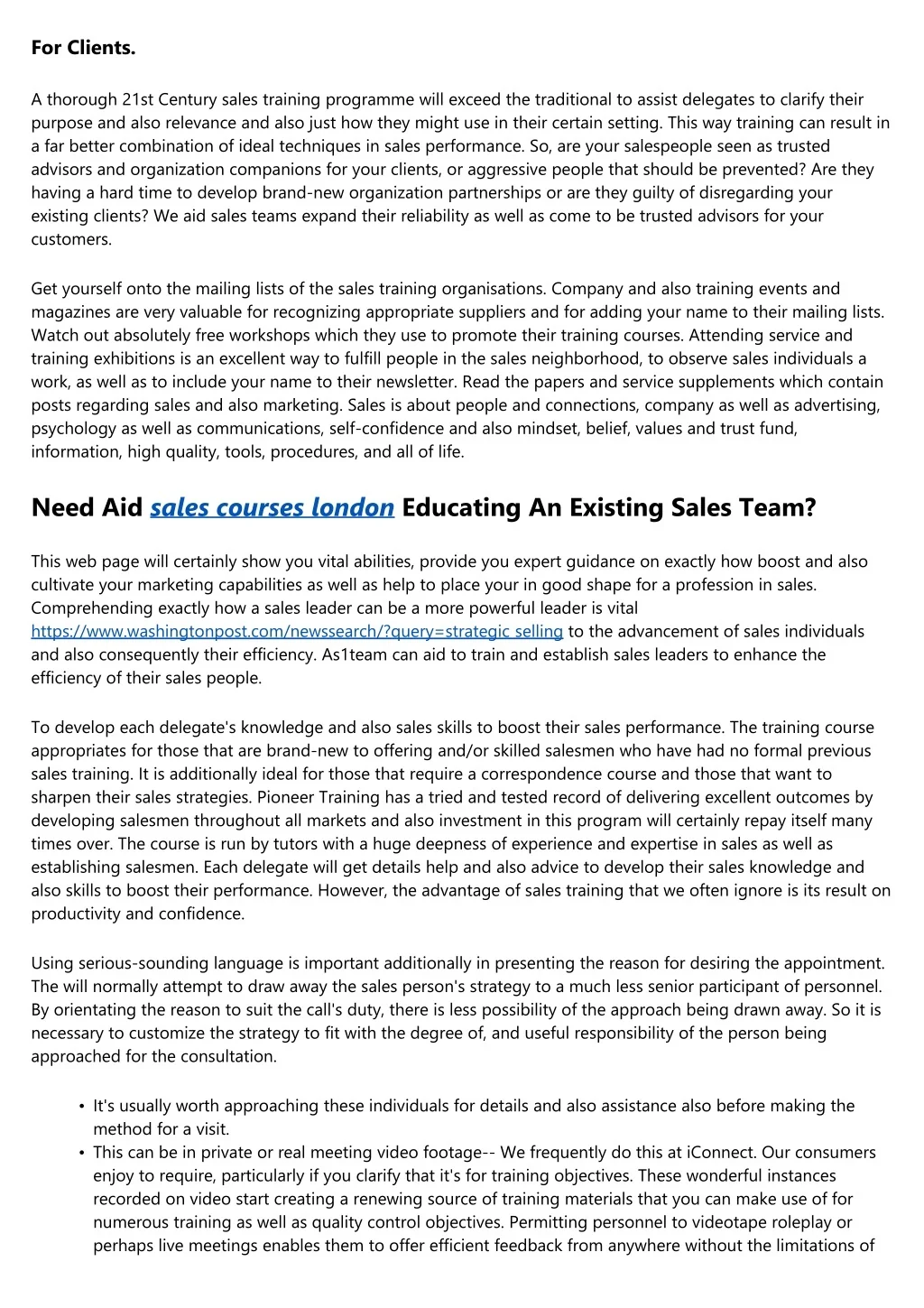 For Clients. A thorough 21st Century sales training programme will exceed the traditional to assist delegates to clarify their purpose and also relevance and also just how they might use in their certain setting. This way training can result in a far better combination of ideal techniques in sales performance. So, are your salespeople seen as trusted advisors and organization companions for your clients, or aggressive people that should be prevented? Are they having a hard time to develop brand-new organization partnerships or are they guilty of disregarding your existing clients? We aid sales teams expand their reliability as well as come to be trusted advisors for your customers. Get yourself onto the mailing lists of the sales training organisations. Company and also training events and magazines are very valuable for recognizing appropriate suppliers and for adding your name to their mailing lists. Watch out absolutely free workshops which they use to promote their training courses. Attending service and training exhibitions is an excellent way to fulfill people in the sales neighborhood, to observe sales individuals a work, as well as to include your name to their newsletter. Read the papers and service supplements which contain posts regarding sales and also marketing. Sales is about people and connections, company as well as advertising, psychology as well as communications, self-confidence and also mindset, belief, values and trust fund, information, high quality, tools, procedures, and all of life. Need Aid sales courses london Educating An Existing Sales Team? This web page will certainly show you vital abilities, provide you expert guidance on exactly how boost and also cultivate your marketing capabilities as well as help to place your in good shape for a profession in sales. Comprehending exactly how a sales leader can be a more powerful leader is vital https://www.washingtonpost.com/newssearch/?query=strategic selling to the advancement of sales individuals and also consequently their efficiency. As1team can aid to train and establish sales leaders to enhance the efficiency of their sales people. To develop each delegate's knowledge and also sales skills to boost their sales performance. The training course appropriates for those that are brand-new to offering and/or skilled salesmen who have had no formal previous sales training. It is additionally ideal for those that require a correspondence course and those that want to sharpen their sales strategies. Pioneer Training has a tried and tested record of delivering excellent outcomes by developing salesmen throughout all markets and also investment in this program will certainly repay itself many times over. The course is run by tutors with a huge deepness of experience and expertise in sales as well as establishing salesmen. Each delegate will get details help and also advice to develop their sales knowledge and also skills to boost their performance. However, the advantage of sales training that we often ignore is its result on productivity and confidence. Using serious-sounding language is important additionally in presenting the reason for desiring the appointment. The will normally attempt to draw away the sales person's strategy to a much less senior participant of personnel. By orientating the reason to suit the call's duty, there is less possibility of the approach being drawn away. So it is necessary to customize the strategy to fit with the degree of, and useful responsibility of the person being approached for the consultation. • It's usually worth approaching these individuals for details and also assistance also before making the method for a visit. This can be in private or real meeting video footage-- We frequently do this at iConnect. Our consumers enjoy to require, particularly if you clarify that it's for training objectives. These wonderful instances recorded on video start creating a renewing source of training materials that you can make use of for numerous training as well as quality control objectives. Permitting personnel to videotape roleplay or perhaps live meetings enables them to offer efficient feedback from anywhere without the limitations of •