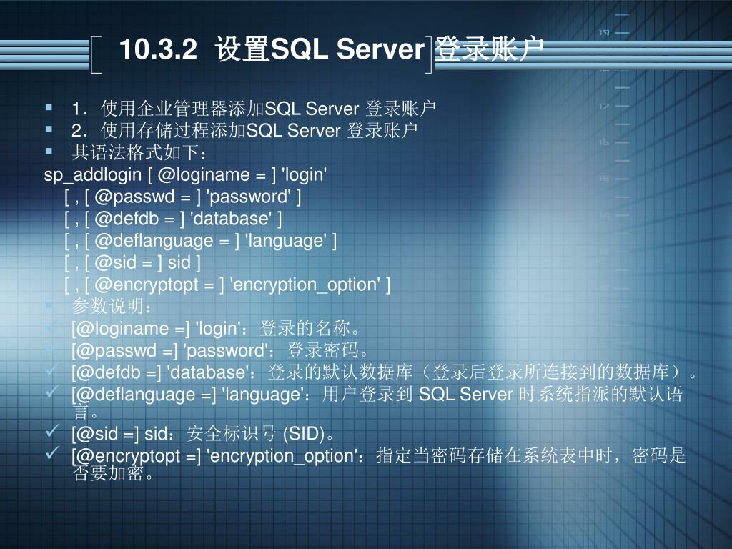 10.3.2 设置SQL Server 登录账户 • 1.使用企业管理器添加SQL Server 登录账户 • 2.使用存储过程添加SQL Server 登录账户 • 其语法格式如下: sp_addlogin [ @loginame = ] 'login' [ , [ @passwd = ] 'password' ] [ , [ @defdb = ] 'database' ] [ , [ @deflanguage = ] 'language' ] [ , [ @sid = ] sid ] [ , [ @encryptopt = ] 'encryption_option' ] • 参数说明: • [@loginame =] 'login':登录的名称。 • [@passwd =] 'password':登录密码。 • [@defdb =] 'database':登录的默认数据库(登录后登录所连接到的数据库)。 • [@deflanguage =] 'language':用户登录到 SQL Server 时系统指派的默认语言。 • [@sid =] sid:安全标识号 (SID)。 • [@encryptopt =] 'encryption_option':指定当密码存储在系统表中时,密码是否要加密。