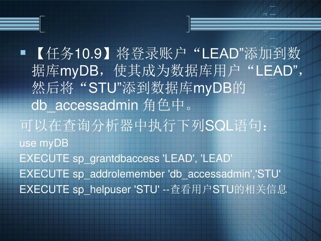 【任务10.9】将登录账户“LEAD”添加到数据库myDB,使其成为数据库用户“LEAD”,然后将“STU”添到数据库myDB的db_accessadmin 角色中。 可以在查询分析器中执行下列SQL语句: use myDB EXECUTE sp_grantdbaccess 'LEAD', 'LEAD' EXECUTE sp_addrolemember 'db_accessadmin','STU' EXECUTE sp_helpuser 'STU' --查看用户STU的相关信息