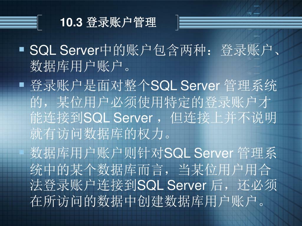 10.3 登录账户管理 • SQL Server中的账户包含两种:登录账户、数据库用户账户。 • 登录账户是面对整个SQL Server 管理系统的,某位用户必须使用特定的登录账户才能连接到SQL Server ,但连接上并不说明就有访问数据库的权力。 • 数据库用户账户则针对SQL Server 管理系统中的某个数据库而言,当某位用户用合法登录账户连接到SQL Server 后,还必须在所访问的数据中创建数据库用户账户。