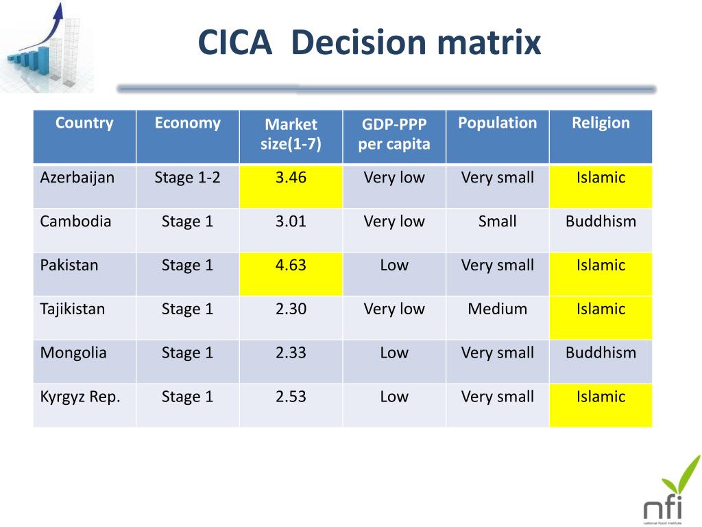 CICA Knowledge centered cooperation Consumer behavior and consumer preferences Food safety policy and STD Agriculture and Food stat. Food supply chain Directory (etc. Importer, exporter , food associations, logistics suppliers)
