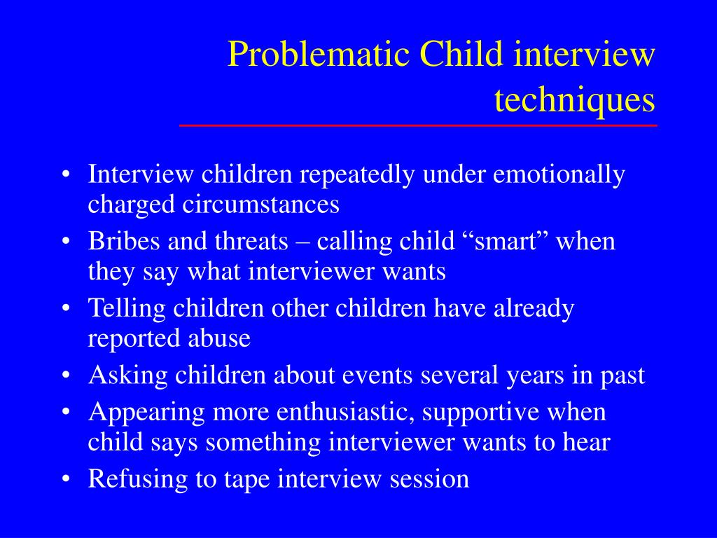 Problematic Child interview techniques • Interview children repeatedly under emotionally charged circumstances • Bribes and threats – calling child “smart” when they say what interviewer wants • Telling children other children have already reported abuse • Asking children about events several years in past • Appearing more enthusiastic, supportive when child says something interviewer wants to hear • Refusing to tape interview session