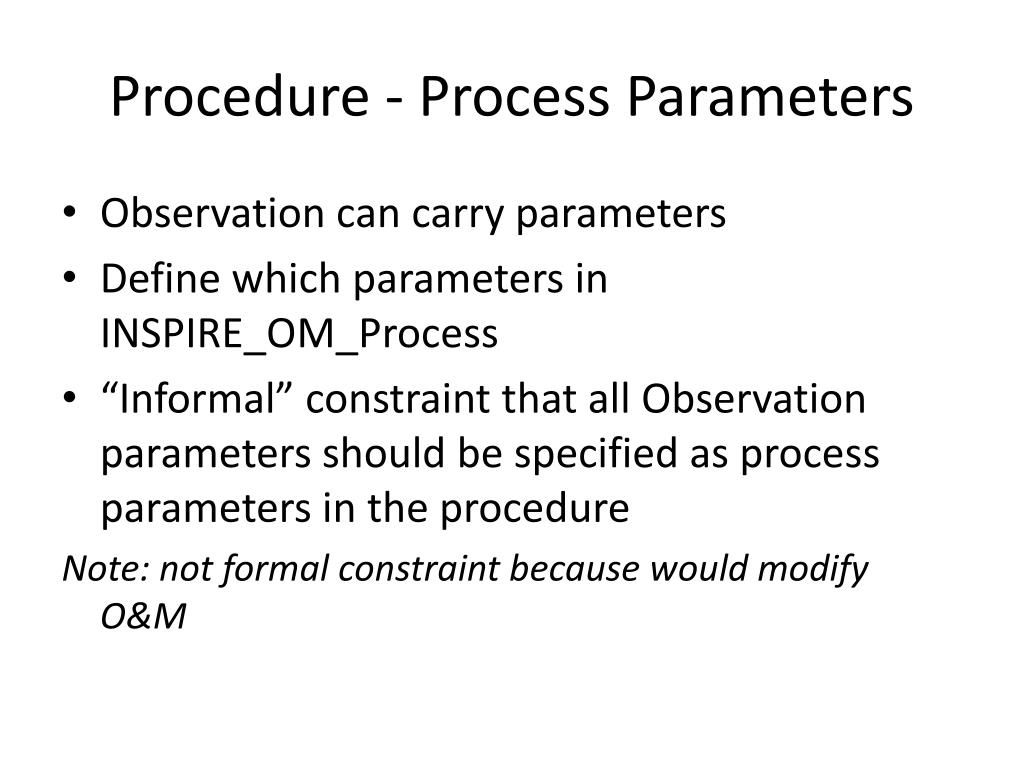 Procedure - Process Parameters • Observation can carry parameters • Define which parameters in INSPIRE_OM_Process • “Informal” constraint that all Observation parameters should be specified as process parameters in the procedure Note: not formal constraint because would modify O&M