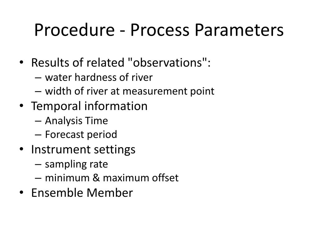 Procedure - Process Parameters • Results of related "observations": • water hardness of river • width of river at measurement point • Temporal information • Analysis Time • Forecast period • Instrument settings • sampling rate • minimum & maximum offset • Ensemble Member