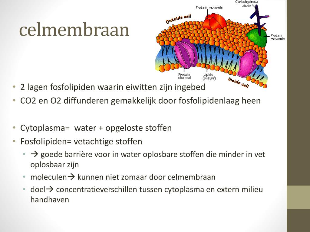 celmembraan • 2 lagen fosfolipiden waarin eiwitten zijn ingebed • CO2 en O2 diffunderen gemakkelijk door fosfolipidenlaag heen • Cytoplasma= water + opgeloste stoffen • Fosfolipiden= vetachtige stoffen • goede barrière voor in water oplosbare stoffen die minder in vet oplosbaar zijn • moleculen kunnen niet zomaar door celmembraan • doel concentratieverschillen tussen cytoplasma en extern milieu handhaven