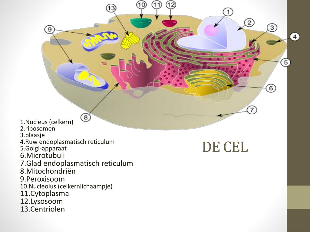 Nucleus (celkern) ribosomen blaasje Ruw endoplasmatisch reticulum Golgi-apparaat Microtubuli Glad endoplasmatisch reticulum Mitochondriën Peroxisoom Nucleolus (celkernlichaampje) Cytoplasma Lysosoom Centriolen De cel