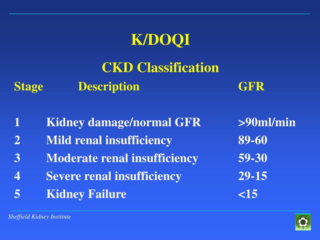 K/DOQI CKD Classification Stage Description GFR 1 Kidney damage/normal GFR >90ml/min 2 Mild renal insufficiency 89-60 3 Moderate renal insufficiency 59-30 4 Severe renal insufficiency 29-15 5 Kidney Failure <15
