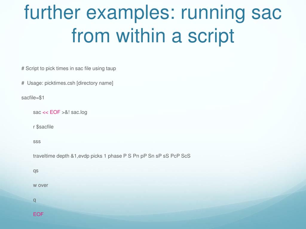 further examples: running sac from within a script # Script to pick times in sac file using taup # Usage: picktimes.csh [directory name] sacfile=$1 sac << EOF >&! sac.log r $sacfile sss traveltime depth &1,evdp picks 1 phase P S PnpPSnsPsSPcPScS qs w over q EOF
