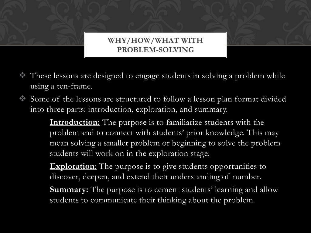 Why/how/what with problem-solving • These lessons are designed to engage students in solving a problem while using a ten-frame. • Some of the lessons are structured to follow a lesson plan format divided into three parts: introduction, exploration, and summary. • Introduction:The purpose is to familiarize students with the problem and to connect with students’ prior knowledge. This may mean solving a smaller problem or beginning to solve the problem students will work on in the exploration stage. • Exploration: The purpose is to give students opportunities to discover, deepen, and extend their understanding of number. • Summary:The purpose is to cement students’ learning and allow students to communicate their thinking about the problem.