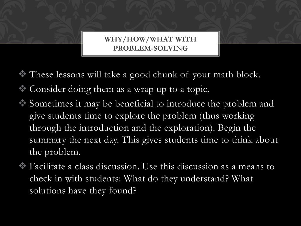 Why/how/what with problem-solving • These lessons will take a good chunk of your math block. • Consider doing them as a wrap up to a topic. • Sometimes it may be beneficial to introduce the problem and give students time to explore the problem (thus working through the introduction and the exploration). Begin the summary the next day. This gives students time to think about the problem. • Facilitate a class discussion. Use this discussion as a means to check in with students: What do they understand? What solutions have they found?