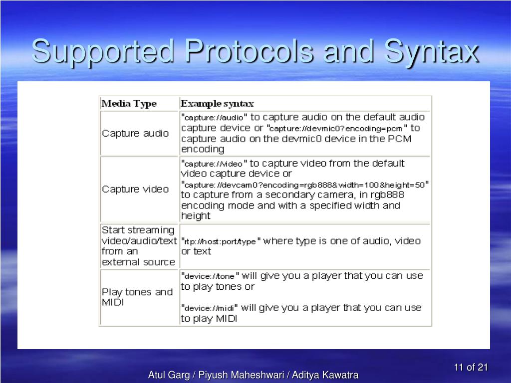 Supported Protocols and Syntax Atul Garg / Piyush Maheshwari / Aditya Kawatra