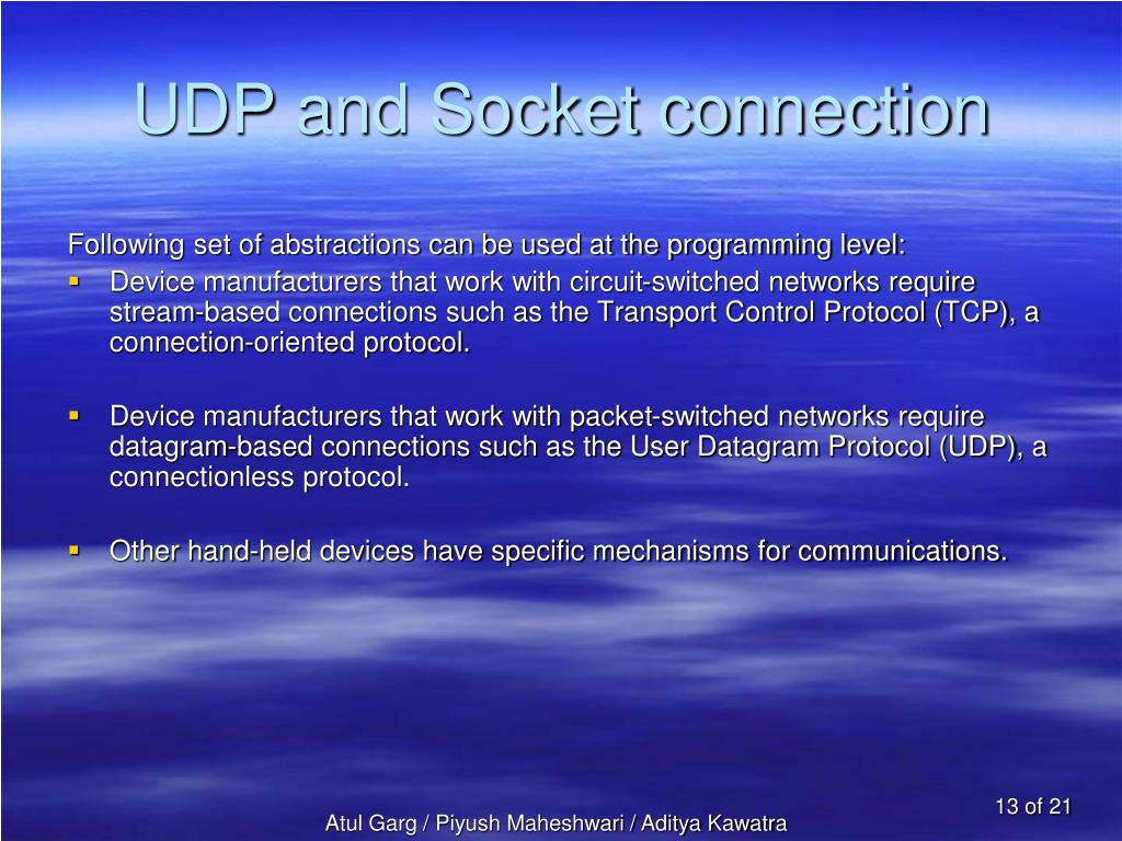 UDP and Socket connection Following set of abstractions can be used at the programming level: • Device manufacturers that work with circuit-switched networks require stream-based connections such as the Transport Control Protocol (TCP), a connection-oriented protocol. • Device manufacturers that work with packet-switched networks require datagram-based connections such as the User Datagram Protocol (UDP), a connectionless protocol. • Other hand-held devices have specific mechanisms for communications. Atul Garg / Piyush Maheshwari / Aditya Kawatra