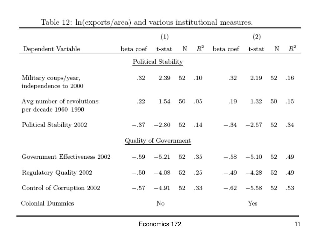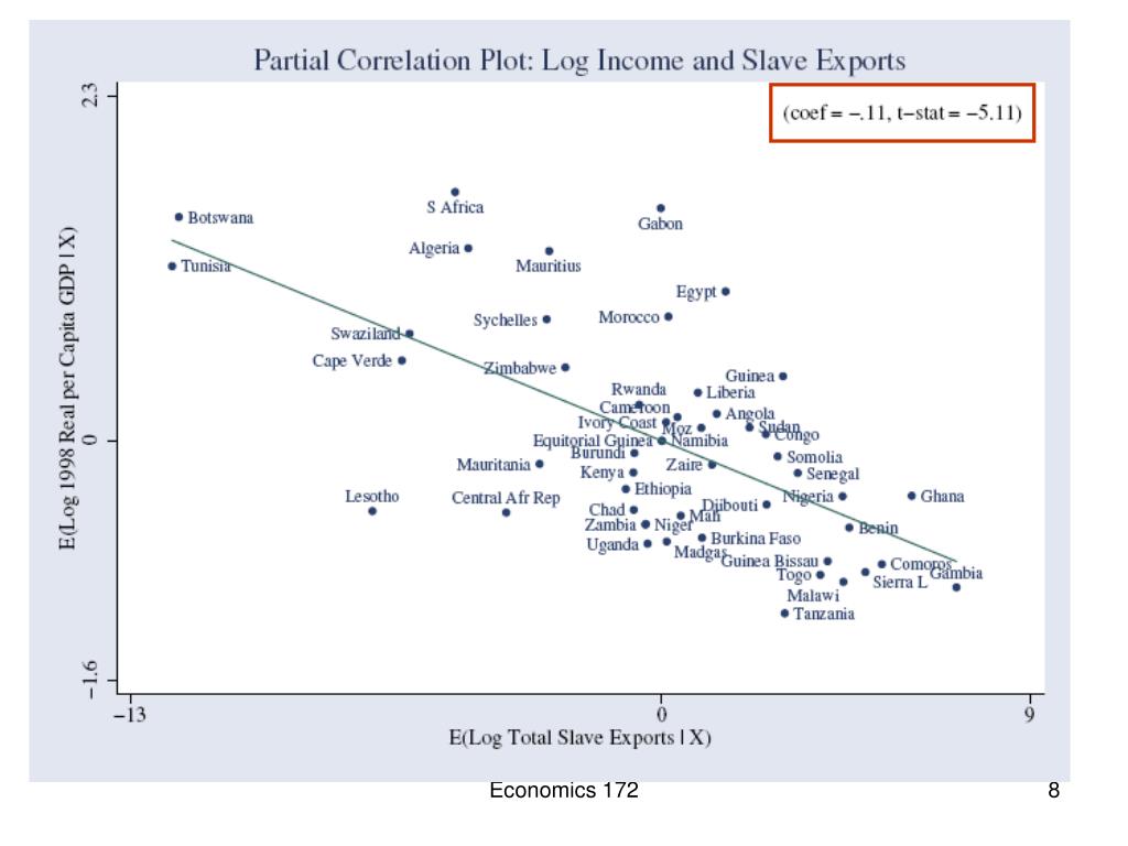 Interpretation of Nunn’s results • Countries most exposed to European slave trading today look much worse off than other African countries. Several of Africa’s success stories (e.g., Botswana) were untouched by the trade Economics 172