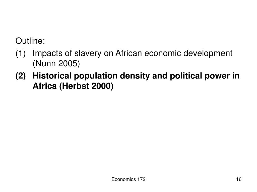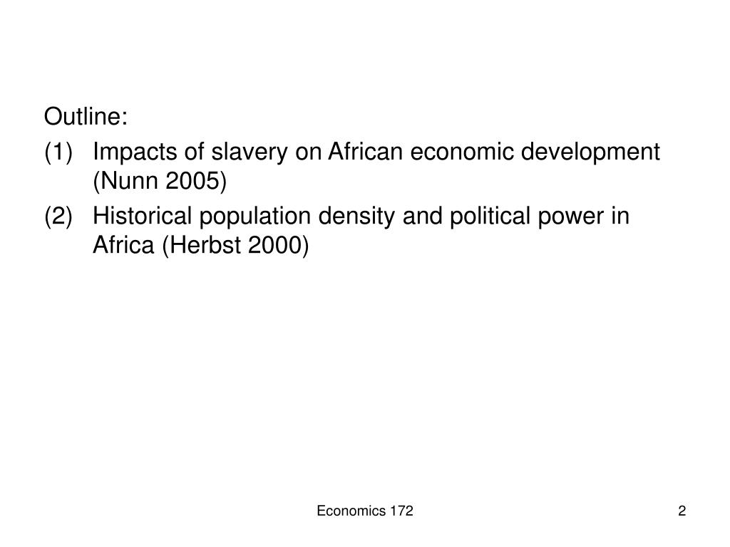 Outline: • Impacts of slavery on African economic development (Nunn 2005) • Historical population density and political power in Africa (Herbst 2000) Economics 172