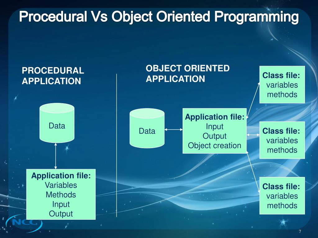 Procedural Vs Object Oriented Programming OBJECT ORIENTED APPLICATION PROCEDURAL APPLICATION Class file: variables methods Data Data Application file: Input Output Object creation Class file: variables methods Application file: Variables Methods Input Output Class file: variables methods