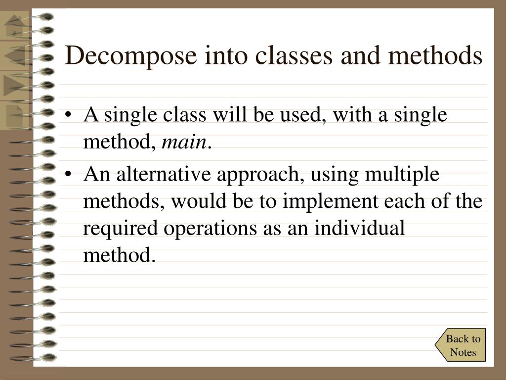 Decompose into classes and methods • A single class will be used, with a single method, main. • An alternative approach, using multiple methods, would be to implement each of the required operations as an individual method. Back toNotes