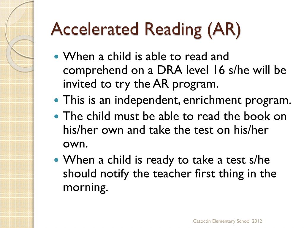 Accelerated Reading (AR) • When a child is able to read and comprehend on a DRA level 16 s/he will be invited to try the AR program. • This is an independent, enrichment program. • The child must be able to read the book on his/her own and take the test on his/her own. • When a child is ready to take a test s/he should notify the teacher first thing in the morning. Catoctin Elementary School 2012
