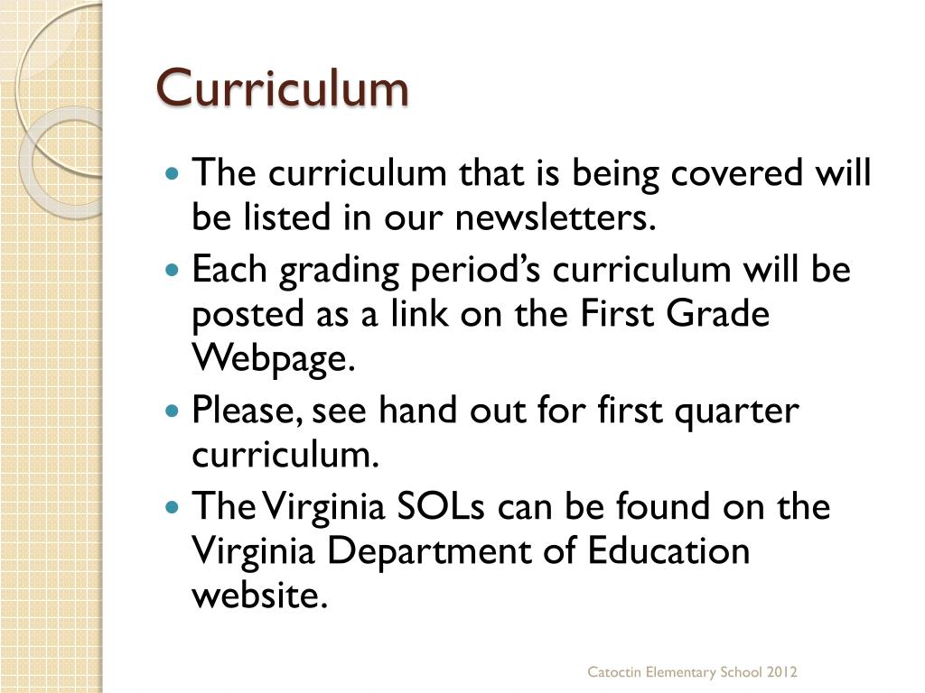 Curriculum • The curriculum that is being covered will be listed in our newsletters. • Each grading period’s curriculum will be posted as a link on the First Grade Webpage. • Please, see hand out for first quarter curriculum. • The Virginia SOLs can be found on the Virginia Department of Education website. Catoctin Elementary School 2012