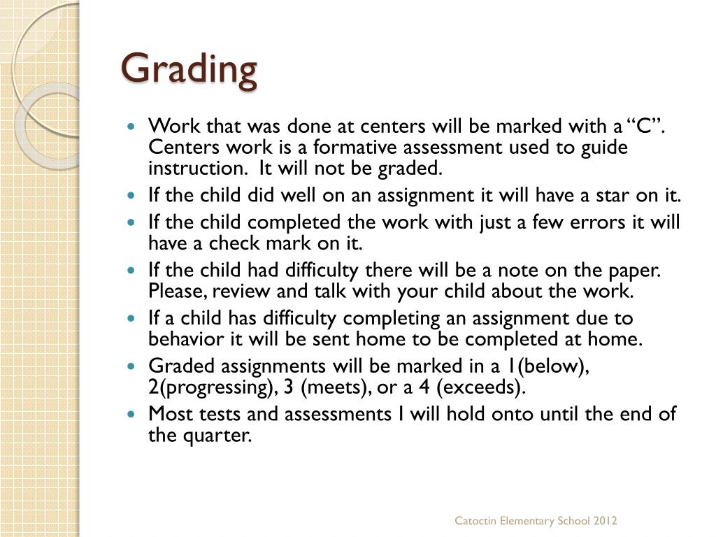 Grading • Work that was done at centers will be marked with a “C”. Centers work is a formative assessment used to guide instruction. It will not be graded. • If the child did well on an assignment it will have a star on it. • If the child completed the work with just a few errors it will have a check mark on it. • If the child had difficulty there will be a note on the paper. Please, review and talk with your child about the work. • If a child has difficulty completing an assignment due to behavior it will be sent home to be completed at home. • Graded assignments will be marked in a 1(below), 2(progressing), 3 (meets), or a 4 (exceeds). • Most tests and assessments I will hold onto until the end of the quarter. Catoctin Elementary School 2012