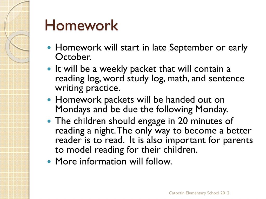 Homework • Homework will start in late September or early October. • It will be a weekly packet that will contain a reading log, word study log, math, and sentence writing practice. • Homework packets will be handed out on Mondays and be due the following Monday. • The children should engage in 20 minutes of reading a night. The only way to become a better reader is to read. It is also important for parents to model reading for their children. • More information will follow. Catoctin Elementary School 2012