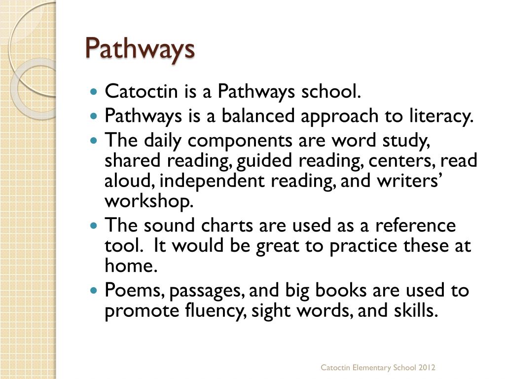 Pathways • Catoctin is a Pathways school. • Pathways is a balanced approach to literacy. • The daily components are word study, shared reading, guided reading, centers, read aloud, independent reading, and writers’ workshop. • The sound charts are used as a reference tool. It would be great to practice these at home. • Poems, passages, and big books are used to promote fluency, sight words, and skills. Catoctin Elementary School 2012